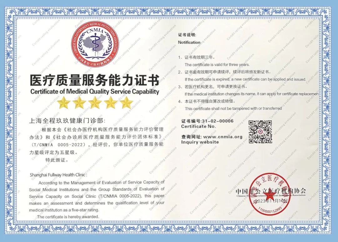 近期,上海鹏欣集团旗下上海全程玖玖健康门诊部接受了中国非公医疗机构协会评价专家组的信用与能力的续评考核,收获了一致认可!喜获中国非公立医疗机构协会“社会信用评价AAA级机构”及“医疗质量服务能力五星级医疗机构”两项殊荣!